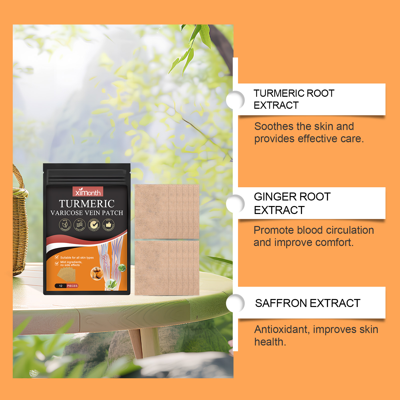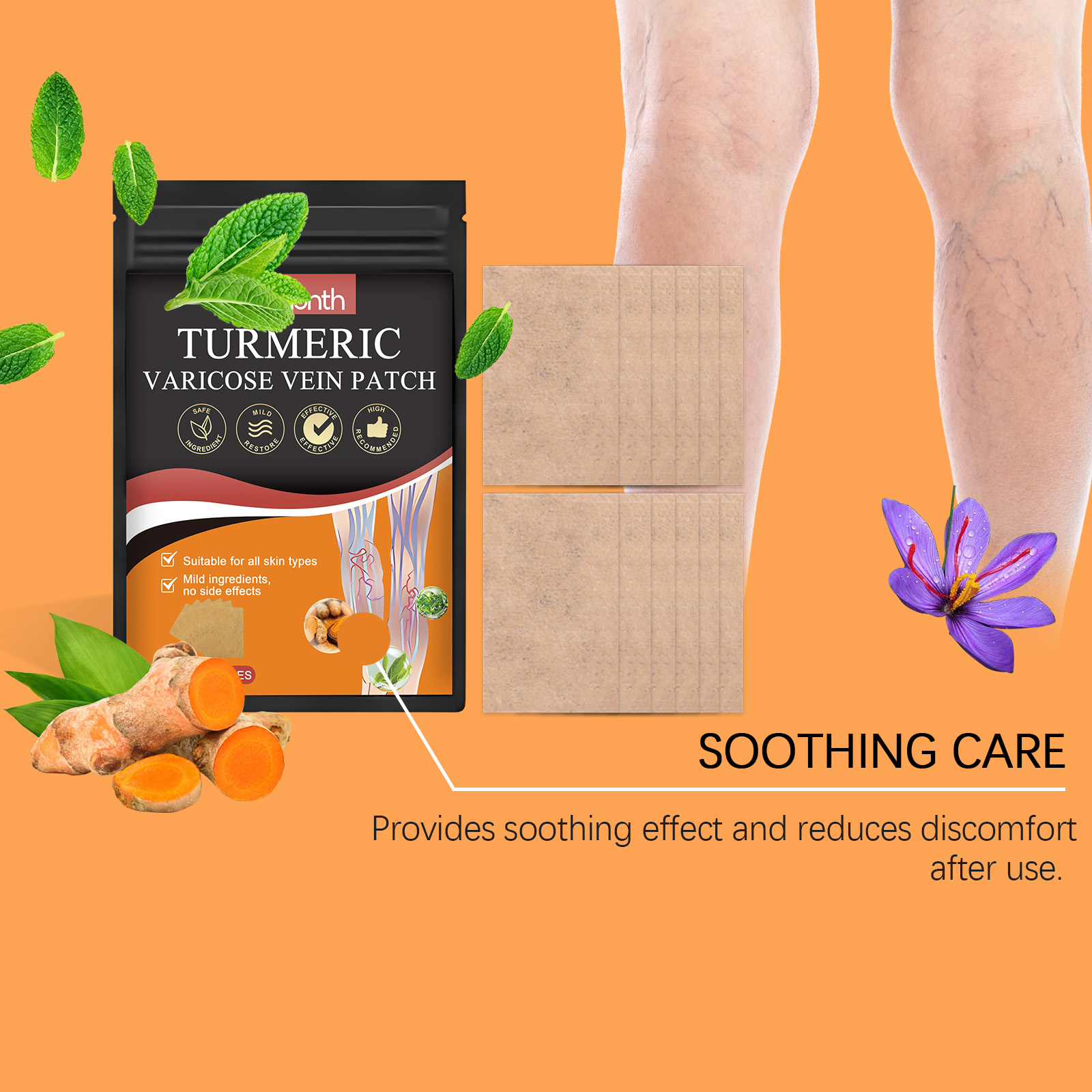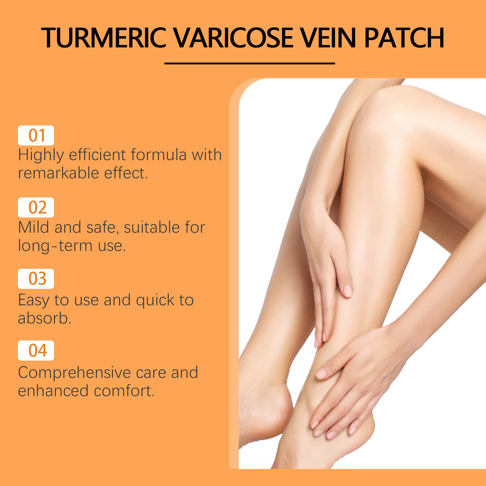 Our leg care patches contain turmeric root extract, ginger root extract and saffron extract. It can soothe the skin and provide effective care. Promote blood circulation and enhance comfort. Antioxidant and improve skin health. Its usage method is very simple: 1. Clean the leg skin and keep it dry; 2. Remove the patch and apply it to the affected area of the leg. Press gently to ensure the patch adheres firmly. Let it stand for 4 hours and then remove the patch. Scientific formula, remarkable care effect. The ingredients are mild and suitable for all skin types. It is safe for long-term use.